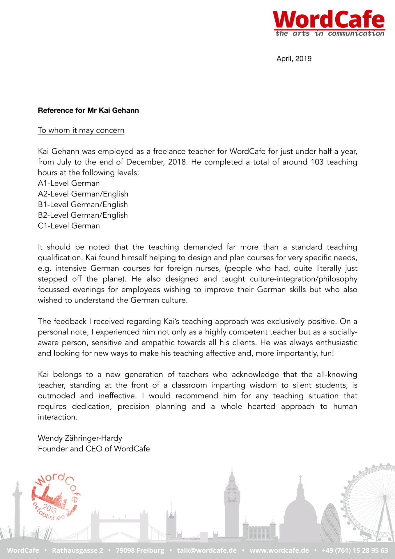 Ich habe Sprachkurse an Sprachschulen und Universitäten gegeben und in verschiedenen Unternehmen wie z.B. Kliniken, Architekturbüros oder Stahlbaubetrieben Mitarbeiter dieser Firmen unterrichtet.